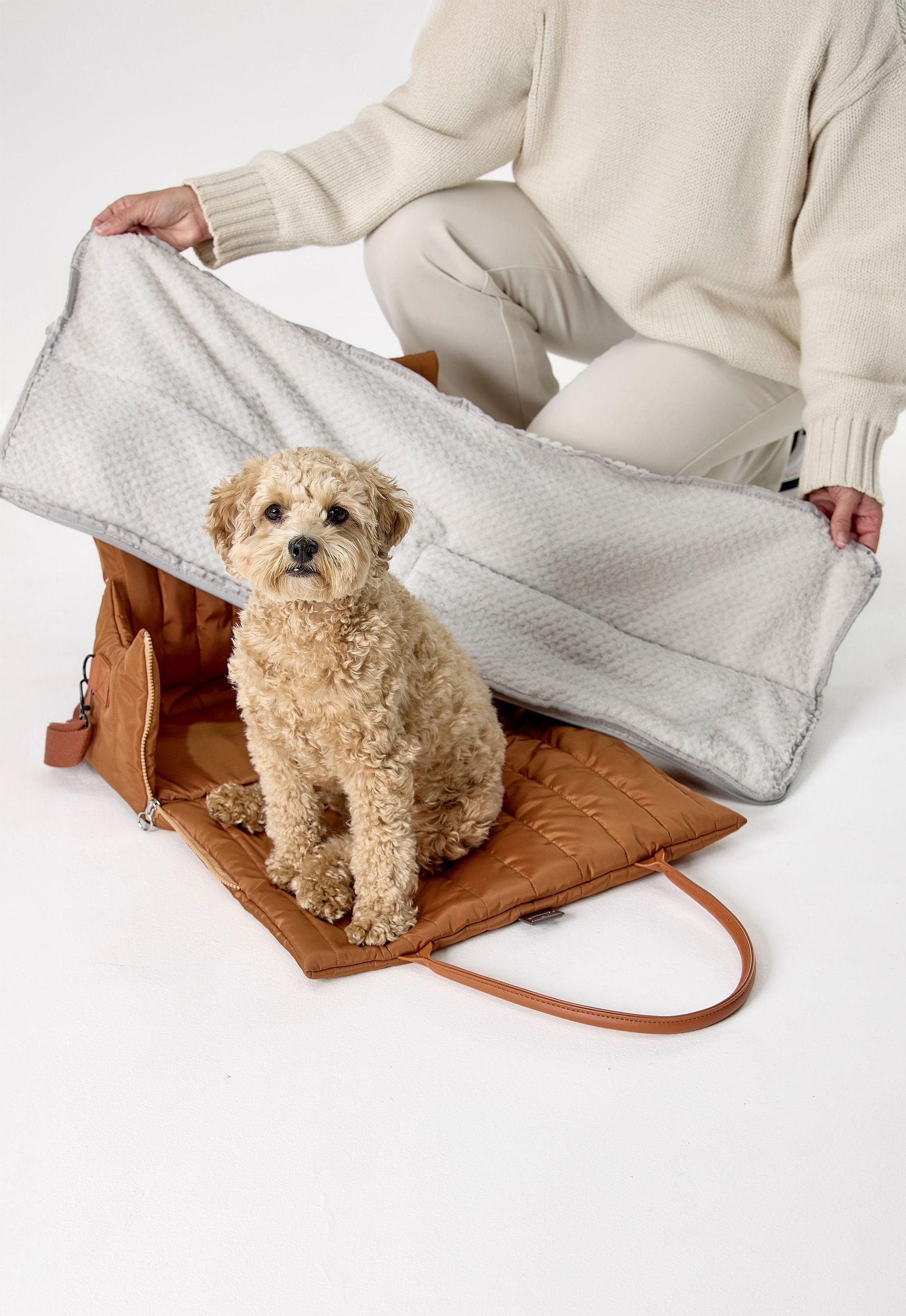 A stylish, multifunctional dog carrier bag that effortlessly unfolds into a comfortable mat — perfect for travel, outings, and everyday adventures. Made with premium, easy-to-clean materials for comfort and style.